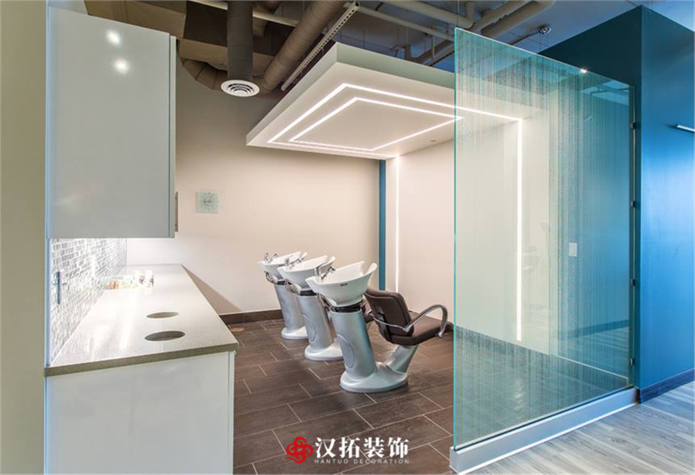 設(shè)計(jì)說明:整體為小清新色調(diào),墻面用天藍(lán)色點(diǎn)綴,讓人心情輕松愉悅,休閑區(qū)備有小零食,讓客戶在等待過程中不無聊,充分滿足客戶的需求,提高客戶的體驗(yàn)感。