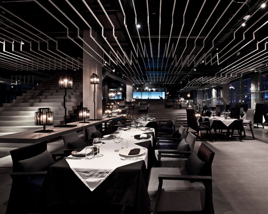 設(shè)計說明:波折線這個元素被頻繁的使用在空間中,樓梯,欄桿,座位,舞臺,燈飾,天花都有。天花上用的是波折的細(xì)鋼絲線,這些線條擋住了天花上的設(shè)備,并連同其它要素將空間變得活力,流動。室外的用餐涼亭也使用到波折線元素,其成為了空間內(nèi)美麗天際線的獨特相框。時尚的元素,家具,裝修,圖案,讓這里充滿吸引力。